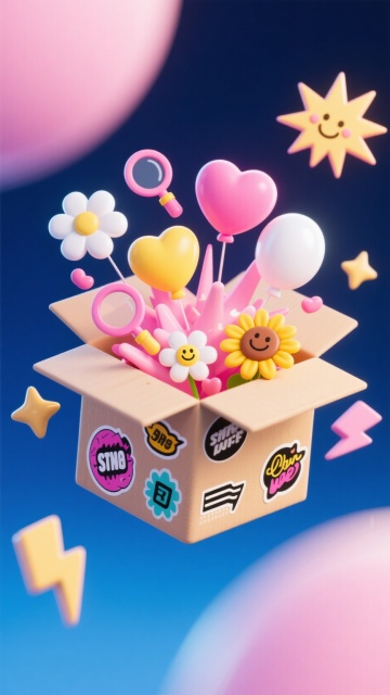 一个造型变换的3D卡通礼物盒,保持纯色背景,采用鲜艳明快的马卡龙配色,具有光滑圆润的塑料质感,表面有柔和的高光和细腻的阴影,整体呈现出可爱治愈的氛围,带有卡通风格的装饰元素,造型独特有趣。