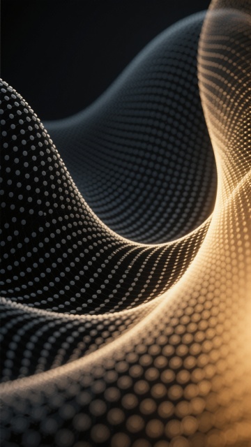 深色背景上,由无数细密的黑色圆形小点组成的网格以流畅的波浪形态扭曲起伏,右侧边缘有一道柔和的金色光线照射,形成渐变的光影效果,整体呈现出具有未来感和科技感的抽象几何纹理,营造出神秘而深邃的氛围。