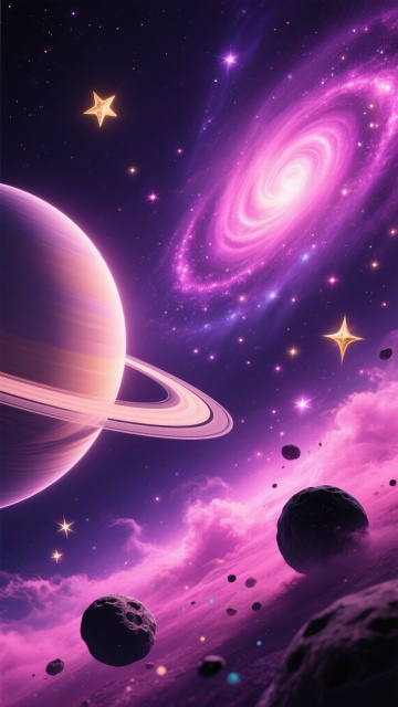 深邃神秘的宇宙星空场景,巨大的行星悬浮在画面左侧,表面有明显的光影明暗对比和环形结构,周围环绕着数颗小型卫星,右侧是螺旋状的星云,呈现出梦幻的紫色与粉色渐变,点缀着无数闪烁的恒星和明亮的星系核心,整体画面采用深邃的紫色与浪漫的粉色为主色调,搭配明亮的黄色恒星光芒和点缀其间的白色星点,营造出神秘而梦幻的宇宙氛围,高清晰度,写实风格,细腻的光影效果,丰富的宇宙元素,层次分明的构图。