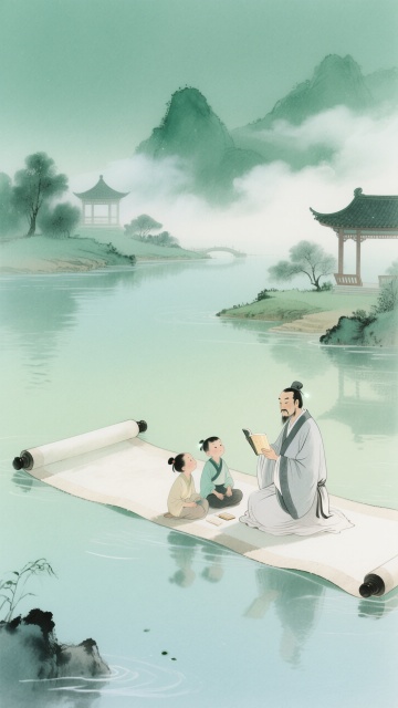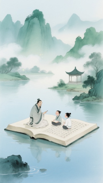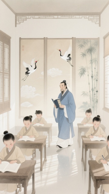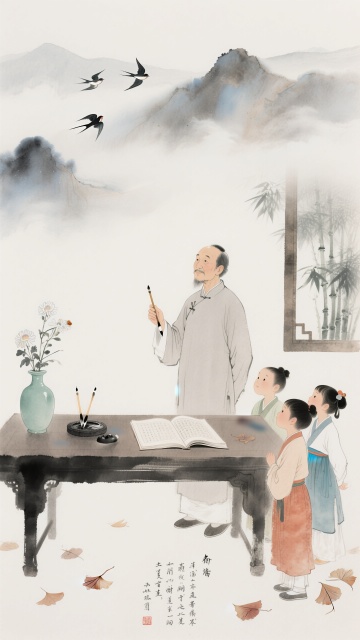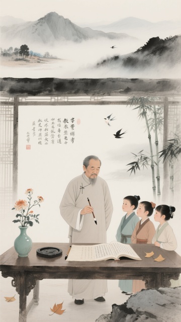 中国水墨画风格,淡雅墨色为主,局部点缀赭石、花青传统色彩,笔触兼具写意与工细,画面留白意境悠远,水墨晕染效果自然,东方古典美学韵味。竖版构图分三层:上部淡墨远山云雾,中部核心场景,下部留白。核心场景中,中老年教师身着素色中式服装,面容温和,手持毛笔立于古朴书案前,案上置砚台、毛笔、宣纸,青瓷瓶插菊花,身旁3-4名6-8岁孩童着传统服饰,呈聆听请教姿态,神态生动。窗外修竹数竿,石桌上打开线装书,飘落2-3片银杏叶,远山云雾间隐现2-3只飞鸟,光线柔和偏暖,通过水墨浓淡表现空间层次,营造尊师重道、书香雅致的温情互动与传统文化传承意境。