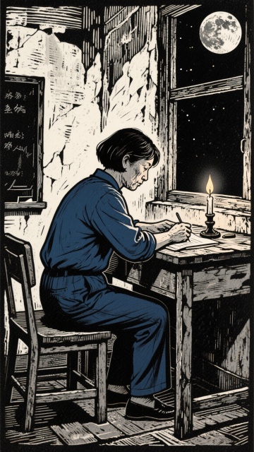 鲁迅,穿着藏蓝色长衫,深夜在家伏案工作,桌上燃烧着蜡烛,窗外月亮挂在天上,版画风格,线条粗犷有力,黑白对比强烈,带有复古质感,细致线条刻画细节与黑白灰关系,密集线条呈现印刷感,精致凹版印刷线条表现明暗关系,灰色网点印刷背景