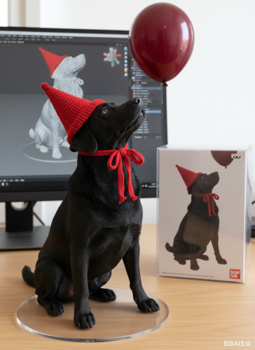 3D重拟物风浮雕质感黑犬戴红帽,喜庆感十足,节日氛围浓厚,结合实物与数字设计呈现创意。