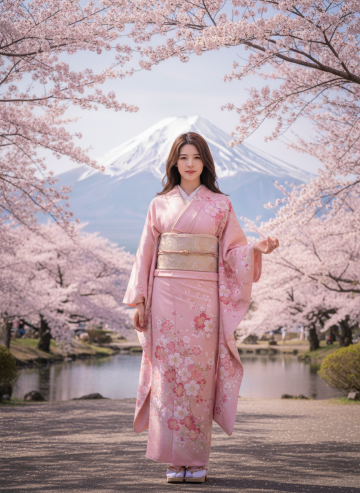 夜幕低垂,京都古寺的朱红色鸟居下,一条被粉白色樱花完全覆盖的幽静参拜道蜿蜒向前,千年古樱的虬曲枝干上缀满夜樱,在深蓝色夜空下泛着神秘的幽光,花瓣如同被月光唤醒的精灵般簌簌飘落,小径上积着厚厚的一层粉白"雪毯",远处传来隐约的晚钟声与琵琶声,地面上灯笼的暖黄色光晕与夜樱的冷粉色形成微妙对比,空气中弥漫着古老木材与樱花的混合香气,远处山峦如墨色剪影般静默矗立。