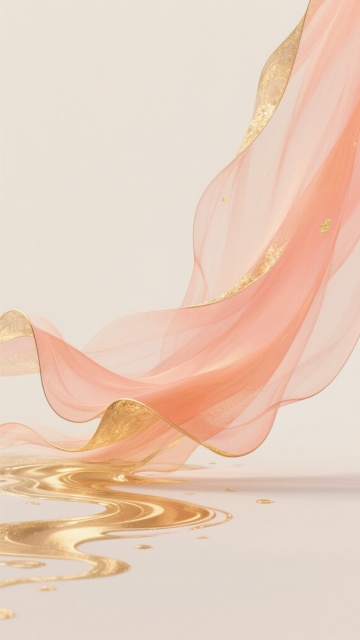 中国风意境插画,以柔和的米白色为背景,画面左侧有一大片飘逸的橙粉色半透明丝绸,丝绸边缘和部分纹理处有金色的渐变描边和点缀,丝绸下方有金色的液态纹理如流水般散开,整体风格空灵雅致,色彩和谐统一,光影柔和,具有东方美学的流动感和韵律美,保持橙粉与金色的主色调,变换丝绸的飘动形态和液体纹理的扩散样式,呈现出新的动态构图。
