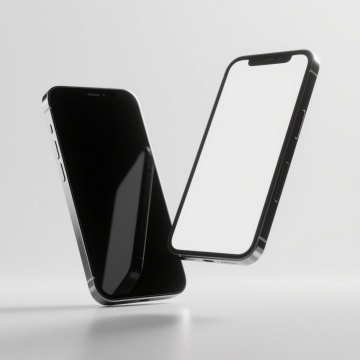 3D渲染风格的智能手机展示图,两部黑色边框智能手机以略微错开的角度并排放置,前面板为纯白色屏幕,机身线条流畅,具有金属质感的边框和细腻的高光反射,整体采用简约的产品展示构图,光线从左上方柔和照射,在手机边缘形成轻微的阴影和高光过渡,背景为纯白色,突出手机的现代设计感和简洁美学。