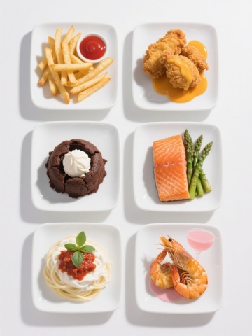 一张高质量餐饮系列素材集合海报,采用纯白色纯色背景,6个规整排布的独立食品展示区域,每个区域均为高清晰、极致写实风格的餐饮元素特写,光线明亮柔和,主光源来自左上方,呈现出自然的高光和细腻阴影,色彩鲜艳饱满且真实,食物质感细节丰富(如食材纹理、酱汁光泽、新鲜度表现)。第一个区域是一碗热气腾腾的日式叉烧拉面,白色瓷碗中装着金黄的面条、几片油亮的叉烧肉、半个溏心蛋、翠绿的葱花和深色的木耳;第二个区域是一份精致的寿司拼盘,包含三文鱼寿司、金枪鱼寿司、蟹肉寿司等,米饭颗粒分明,鱼片新鲜有光泽,摆放在黑色长方形寿司盘上;第三个区域是一只烤得焦黄酥脆的炸鸡,外皮金黄诱人,内部肉质鲜嫩多汁,旁边点缀着绿色的生菜叶,放在白色圆形餐盘中;第四个区域是一碗色彩丰富的水果沙拉,透明玻璃碗中装着草莓、蓝莓、香蕉片、猕猴桃片和生菜,上面淋着一层透明的蜂蜜或酸奶;第五个区域是一份意大利番茄肉酱面,白色宽口碗中装着红色的肉酱覆盖在螺旋形意面上,撒有绿色的罗勒叶和白色的帕玛森芝士碎;第六个区域是一块装饰精美的巧克力蛋糕,深棕色的蛋糕体层次分明,表面覆盖着光滑的巧克力酱,顶部点缀着一颗红色的草莓和少量白色奶油花纹,放在银色的蛋糕托盘上。整体设计简洁大方,信息传达直接高效,视觉层级清晰,每个食品元素都占据独立且相等的空间,无任何文字、LOGO、电话地址及二维码。