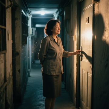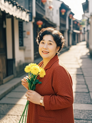 一名中年母亲,胖胖的,70年代复古穿搭,在乌镇小巷散步,眼睛看着镜头,保留人物脸部特征