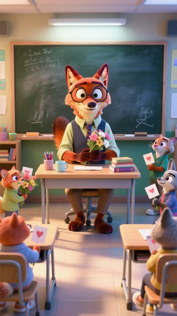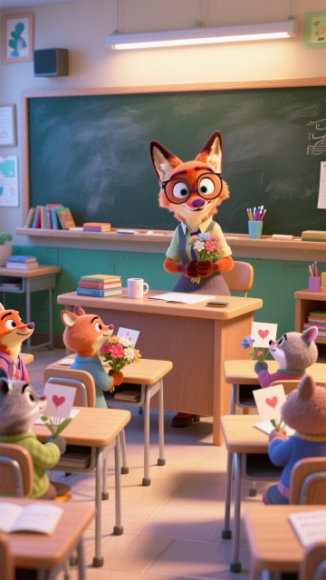 卡通风格的教室里,拟人化的动物学生们为老师送上鲜花和贺卡,充满可爱与温馨。