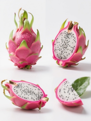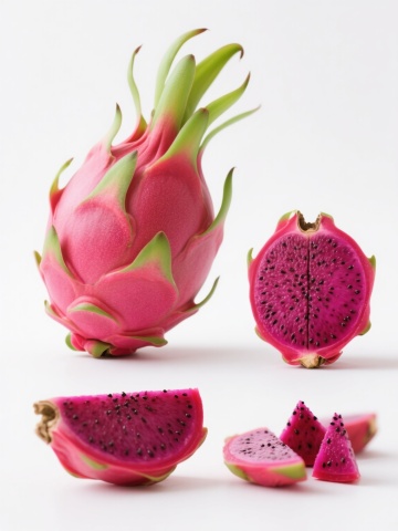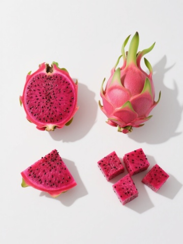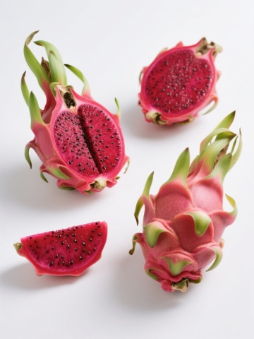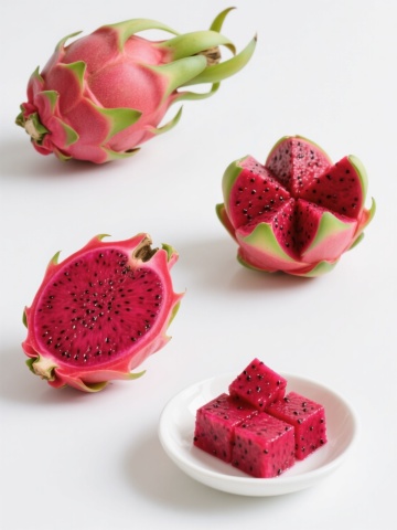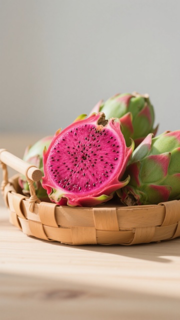 一组新鲜的红心火龙果,部分果实被切开,露出内部鲜艳的紫红色果肉和密集的黑色小籽,果皮呈现红绿渐变的鳞片状,整体放置在一个浅棕色的编织竹篮中,竹篮带有木质把手,背景是浅色木质桌面,光线明亮柔和,从斜上方照射下来,在水果表面形成自然的高光和细微阴影,突出火龙果果肉的水润质感和果皮的光泽,整体画面风格写实、干净、清新,构图以竹篮为中心,切开的火龙果位于前方偏中心位置,完整的火龙果在后方堆叠,营造出层次感和自然的生活气息。