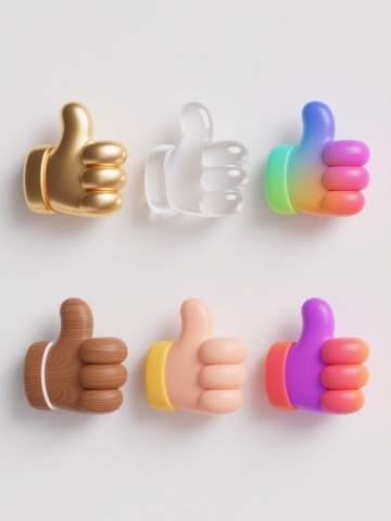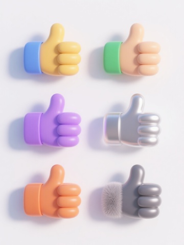 3D渲染风格,6个不同配色、不同样式、不同材质的「点赞」造型图标,上下两行各3个整齐对齐排列,整体呈现卡通可爱的艺术风格,主色调丰富多样,每个点赞图标具有平滑的渐变色彩过渡,柔和的顶部光源,轻微的阴影细节增强立体感,高光表现使材质质感鲜明,有的点赞造型带有金属光泽,有的呈现磨砂质感,有的则是光滑的塑料效果,背景为浅色,简洁干净,突出点赞图标的视觉主体,整体构图平衡对称,视觉层级清晰,信息传达直接高效,符合现代图标设计的简洁与识别性要求。