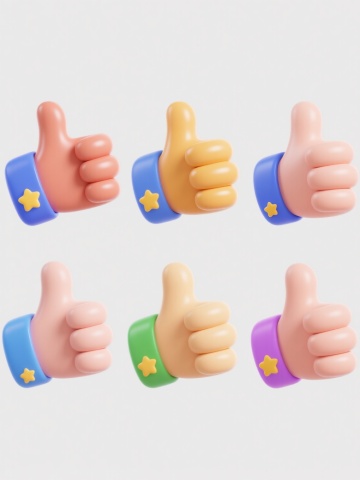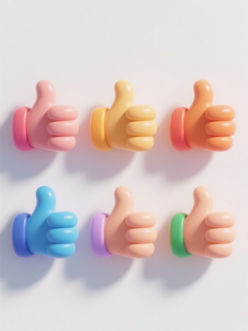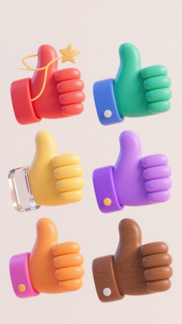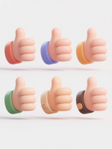 3D卡通风格,六个不同配色(如红色、蓝色、绿色、黄色、紫色、橙色)、不同样式(如带星星、带闪光、简约线条、立体浮雕、圆润饱满、棱角分明)、不同材质(如光滑塑料、磨砂金属、半透明水晶、哑光橡胶、木纹纹理、光泽漆面)的「点赞」手势造型,每个点赞手势细节丰富,立体感强,拥有柔和的高光和自然阴影,排列成上下两行各三个整齐对齐,背景为纯净浅色,整体画面色彩明快和谐,视觉层次清晰,符合现代设计感。