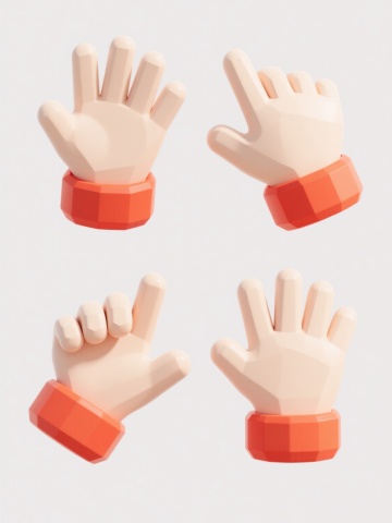 一组4个不同手部动作的3D卡通风格图标,每个图标均为圆润光滑的米白色手部造型,搭配鲜艳的橙红色手腕环,采用柔和均匀的光影效果,高光细腻,阴影自然过渡,整体呈现出可爱、简洁的设计感,所有手部动作均保持统一的低多边形3D建模风格和配色方案,背景为纯白色。