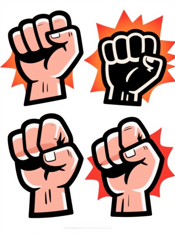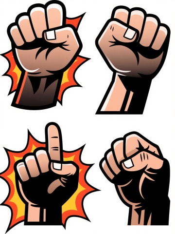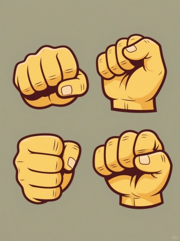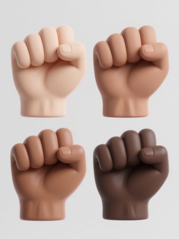 一组4个不同肤色的拳头元素,干净风格,符合现实逻辑,适用于素材使用。每个拳头都有不同的样式,展示出不同的力量感和姿态。画面采用纯白色背景,突出拳头的细节和质感。光线均匀柔和,清晰展现手部的肌肉线条、骨骼结构和皮肤纹理。每个拳头的肤色各不相同,包括浅肤色、中肤色、深肤色等,展现多样性。拳头的姿态各异,有的紧握有力,有的略微放松,有的拳眼向上,有的拳眼向前。整体画面简洁明了,没有多余的元素干扰,适合作为设计素材使用。