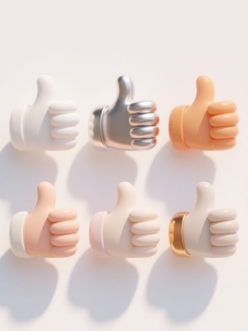 3D立体风格,6个不同样式不同材质的大拇指造型,均为竖起的点赞手势,白色纯净背景,整齐排列成一行或两行,整体呈现圆润可爱的卡通感,柔和的边缘处理,细腻的光泽表现,每个大拇指拥有独特的材质质感(如光滑塑料、磨砂金属、半透明果冻、柔软橡胶、哑光陶瓷、亮面烤漆等),温暖的色调基础上搭配各自材质对应的色彩变化,统一的光影效果,光源来自左上方,产生柔和的阴影和自然的高光,营造出轻松愉快的氛围,保持与原图一致的3D建模风格和圆润可爱的设计语言,所有大拇指大小相近,间距均匀,构图平衡对称,视觉层级清晰,突出每个大拇指的独特材质和造型细节。