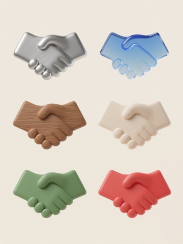 六个风格统一的握手图标,以简约线条风格呈现,左右两行对齐排列,每个握手造型拥有独特的配色、样式和材质表现——包括金属质感的银灰色握手、渐变蓝的玻璃质感握手、木质纹理的棕色握手、磨砂塑料的绿色握手、光滑陶瓷的米色握手和带有光泽的红色橡胶握手,所有图标均放置于浅色背景上,保持清晰的视觉层次和现代简约的设计感。