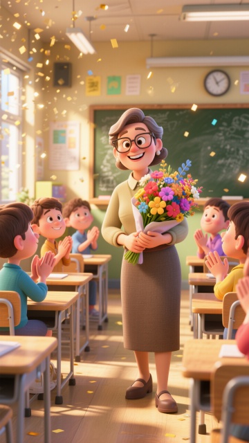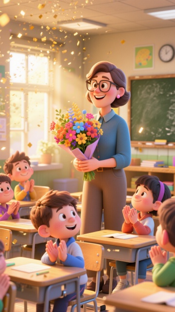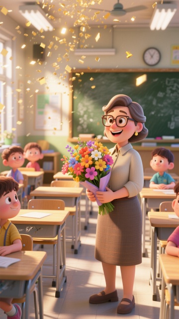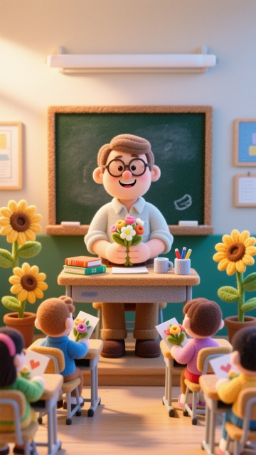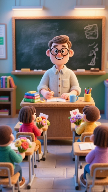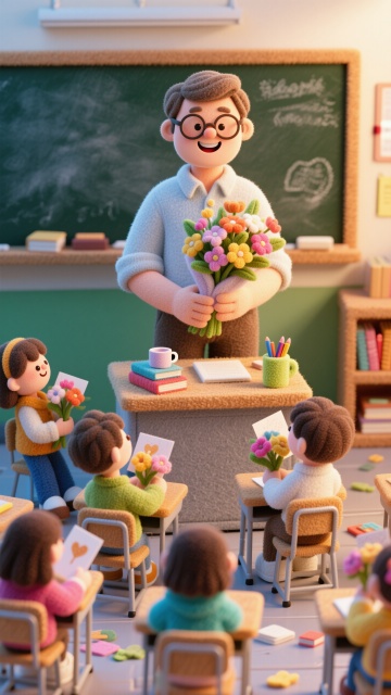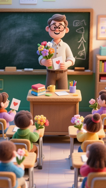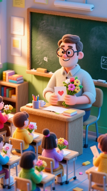 温馨软3D风教室,卡通老师手捧花束与爱心卡片,学生献礼,节日氛围浓厚。