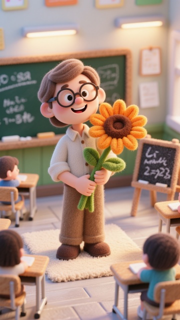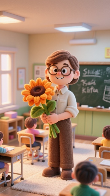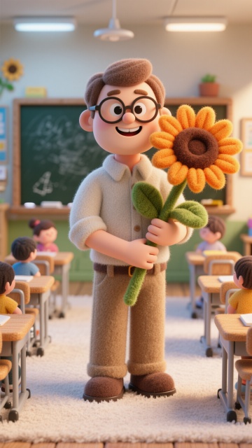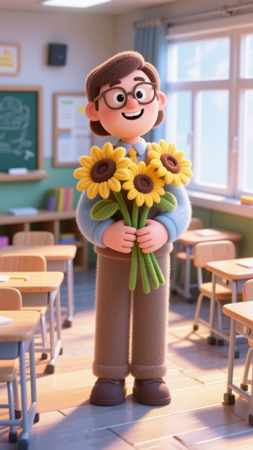 3D卡通风格,拟人化老师手持毛茸茸向日葵,教室温馨可爱,充满童趣。