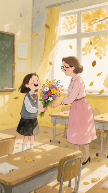 插画风教师节场景,清新温馨,学生献花,落叶飘洒,满溢感恩之情。