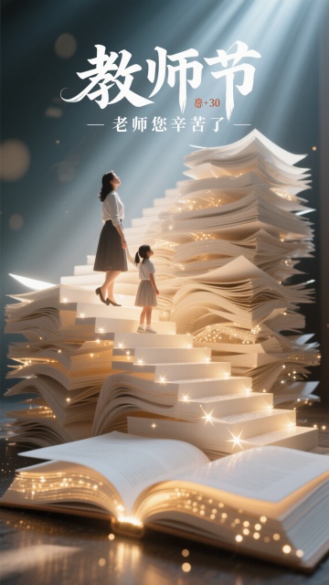 杰作,8K,CG画质,视觉冲击力强,创意教师节插画。 画面中央,一位微卷发、戴眼镜的男老师(米色衬衫)将画面分割。他面朝左侧梦幻天空,右手抱书,左手掷出纸飞机。每架纸飞机上都坐着一个穿学士服、捧花大笑的学生。天空有气球,白云组成“教师节快乐”。老师身后是右侧教室场景,温暖阳光洒满教室,学生们都回头面带憧憬笑容地看着老师。超清细节,梦幻交融。