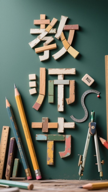 "教师节"文字,三个字的笔画由不同的文具拼接而成,放在一块简单的墨绿色背景上。