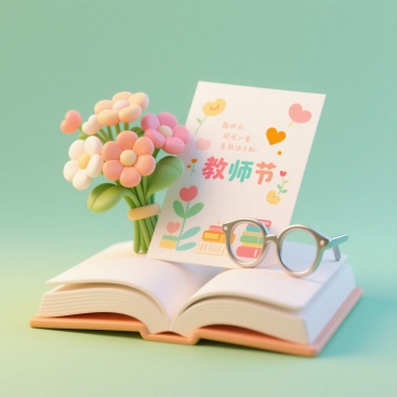 3D卡通风格,特写学生手持花束递给戴眼镜的美女教师,虚化的教室黑板背景带有粉笔字痕迹,"教师节快乐"飘逸文字设计,悬浮在海报顶部,景深效果突出空间层次,前景可以虚化。采用卡通渲染技术增强画面亲和力。c4d建模,大师构图