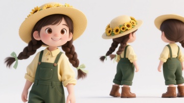 软3D风卡通女孩,拟人化设计,戴向日葵草帽,穿黄衫绿背带裤,清新可爱,柔和舒适,传递春日田园治愈感。