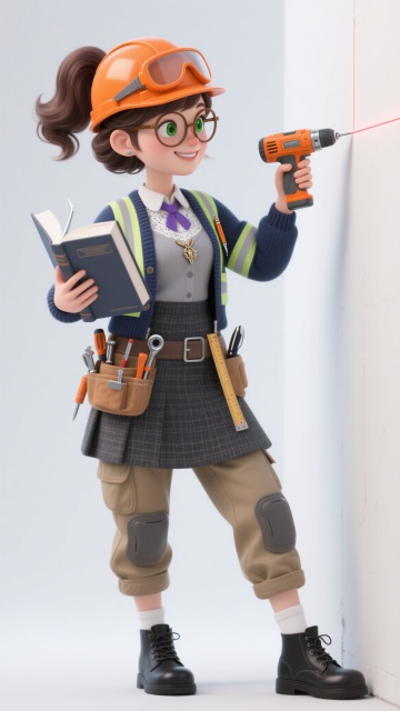3D卡通风格年轻女性,戴着橙色护目镜式安全帽,亚麻色短发扎成利落高马尾,翡翠绿眼眸专注而明亮,嘴角噙着自信微笑,左手持激光水平仪投射红线,右手紧握橙色电钻对准墙面,内穿灰色工装背心,外搭反光条工装夹克,腰间挂着工具带插满螺丝刀与卷尺,穿着卡其色多口袋工装裤(膝盖处有防护垫),脚蹬钢头安全靴,整体造型干练专业,色彩以工业橙与机械灰为主调,光影强调金属质感与人物轮廓,人物姿态展现施工中的动态平衡感,背景为纯白色。 3D卡通风格年轻女性,戴着玳瑁纹圆框眼镜,深棕色长卷发在脑后盘成优雅发髻,紫罗兰色眼眸透着知性光芒,唇边带着温柔浅笑,左手托着厚重精装书,右手正用银色书签标记页码,内穿白色蕾丝衬衫,外搭海军蓝学院风针织开衫,胸前别着古典钢笔造型胸针,穿着深灰色A字羊毛裙,裙摆点缀细小格纹,脚蹬黑色玛丽珍皮鞋配白色棉袜,整体造型书卷气十足,色彩以墨蓝与象牙白为主调,光影营造柔和的阅读氛围,人物姿态呈现静坐沉思的优雅感,背景为纯白色。 3D卡通风格年轻女性,戴着亮粉色厨师高帽,酒红色短发用彩色发夹别成不对称造型,琥珀色眼睛闪烁着热情光芒,脸颊沾着少许面粉笑容开朗,左手端着刚出炉的草莓挞,右手正用裱花袋装饰奶油,内穿白色厨师服,外搭红色格纹围裙系着蝴蝶结,胸前口袋插着温度计与食谱卡片,穿着黑色紧身七分裤,脚蹬防滑厨师鞋,手腕戴着卡通隔热手套,整体造型活泼明快,色彩以草莓红与奶油黄为主调,光影突出甜点光泽与人物愉悦表情,人物姿态展现烘焙中的灵动瞬间,背景为纯白色。