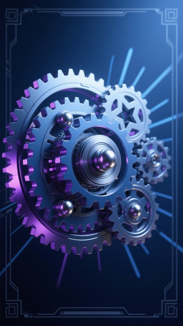 高精度3D渲染的机械齿轮装置艺术海报,采用深蓝与银色为主色调,搭配暗紫色点缀,呈现出神秘而科技感十足的氛围。中心为复杂精密的齿轮系统,改变了原有的复古齿轮造型,设计成更具未来感的多面体齿轮与流线型齿片组合,部分齿轮边缘带有锐利的几何切面和镂空星芒图案。齿轮组以多层同心圆结构精密咬合,中心齿轮为哑光银色,外围齿轮呈现深蓝金属质感并带有细微的紫色反光,齿轮轴点为高亮银色金属球。背景为深邃的暗蓝色,边缘装饰有简化的几何纹样边框,内部隐约可见放射状的淡蓝色光晕,增强空间层次感。整体光影采用侧上方的冷色调光源,齿轮表面形成清晰的明暗对比,金属质感强烈,阴影深邃,细节丰富,营造出既精密又充满未来工业美学的视觉效果。