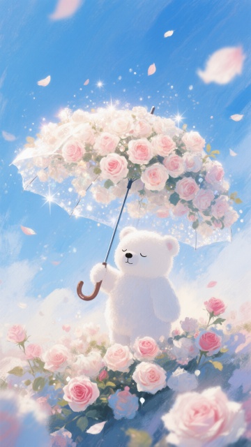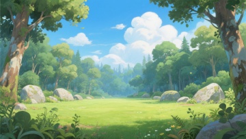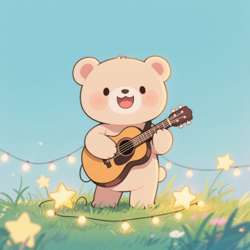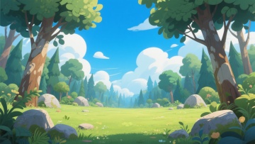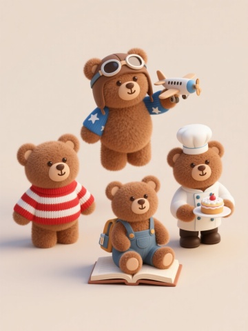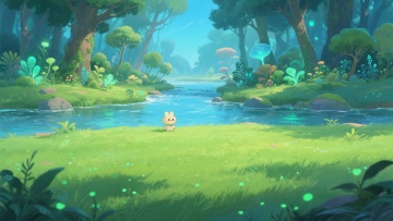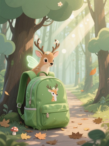 书包特写 + 卡通IP守护精灵 一只蓝色小熊造型的儿童书包放在草地上,书包细节清晰(反光条、护脊设计),旁边浮现一个半透明的卡通小熊精灵,微笑着轻轻托住书包,背景是秋日树林与柔光,梦幻温暖,突出陪伴感,16:9横版广告图