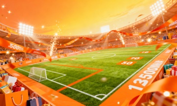 夜晚的大型足球场,明亮的聚光灯从高耸的钢结构屋顶倾泻而下,照亮整个绿茵茵的草坪和四周坐满观众的看台,天空呈现出深邃的暗紫色调,点缀着稀疏的云朵,营造出梦幻而热烈的比赛氛围,足球场上清晰可见白色的标线和位于中央的足球门,整体画面采用写实风格,光影对比强烈,色彩以暗紫色天空、绿色草坪和白色灯光为主,构图呈现出对称的视觉美感,突出足球场的宏伟与壮观。