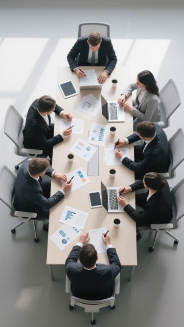一张高清写实风格的商务工作场景照片,画面聚焦于几位身着正式西装的商务人士正在不同办公环境中协作工作的场景。光线明亮柔和,采用自然光源,色调以专业的蓝灰色系为主,搭配白色和浅木色的办公家具,营造出专业、高效、现代的办公氛围。前景中,人物的手部动作清晰,或正在使用平板电脑查看数据图表,或在文件上进行标注,手指细节和服装质感(如西装面料的纹理、衬衫的挺括)表现细腻。办公桌上整齐摆放着带有数据图表的文件、笔记本电脑、钢笔等办公用品,图表线条清晰,数据可视化效果专业。背景可根据不同场景进行调整,如开放式办公区、独立办公室、会议室等,保持整体构图采用三分法,主体人物位于画面中心偏下位置,背景环境元素(如办公隔断、同事、窗外城市景观等)虚化处理以突出主体,同时保持画面的纵深感和空间感。整体画面具有清晰的视觉层次,色彩和谐统一,光影过渡自然,细节丰富,充分展现商务人士专注、协作的工作状态,符合现代企业高效专业的形象定位。