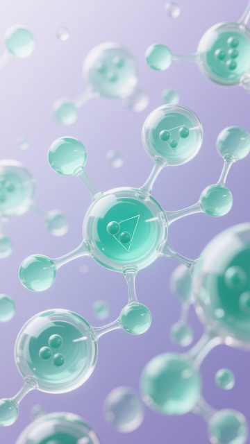 3D渲染风格的分子结构插画,画面整体以清新的薄荷绿与淡紫色为主色调,透明感玻璃质地的圆形分子结构规整排布,内部包裹着深浅不一的薄荷绿色液态核心,部分分子内含有多颗小圆球或呈三角形连接状态,透明流线型的细丝在分子间优雅穿插,背景为柔和渐变的淡紫色,点缀着大小不一、半透明的薄荷绿色气泡与光晕,整体光影柔和,高光细腻,营造出纯净、科技感与自然清新并存的氛围,分子结构大小有别且分布均匀有序,画面平衡且富有层次感。