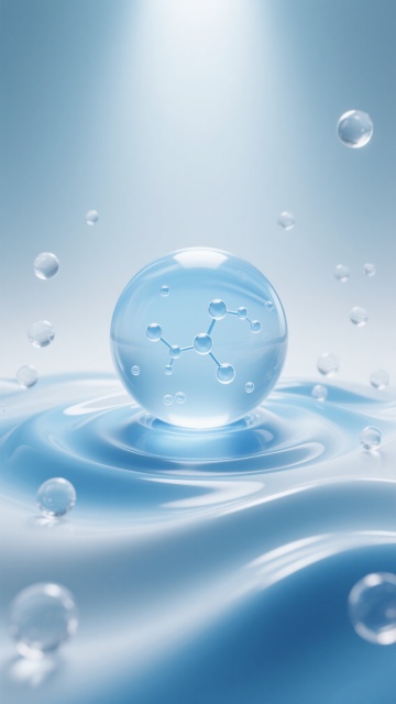 超写实3D渲染的水分子结构背景,透明玻璃质感的球体通过纤细连接链形成分子模型,表面有细微水珠和内部液体流动纹理,整体笼罩在柔和的浅蓝色调中,光线从上方柔和投射形成清晰的高光与渐变阴影,背景虚化处理呈现朦胧的光晕和流动感,无数微小气泡悬浮在空间中,营造出纯净、科技、梦幻且具有深度的视觉效果,画面整体通透洁净,细节丰富,光影层次分明,适合作为背景使用。