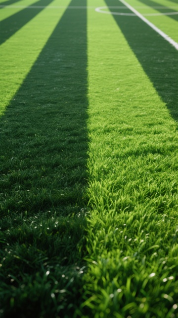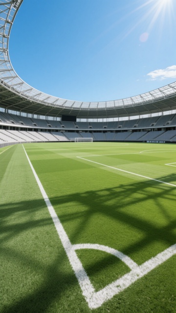 写实风格的足球场景,专业室内足球训练场,绿色人造草坪纹理清晰,白色边界线规整,蓝白相间的足球置于角落边界线上,顶部是透明顶棚结构,金属框架支撑,自然光透过顶棚洒下形成明亮光影,地面有足球和顶棚结构的清晰阴影,整体氛围专业、整洁、充满运动感,可从不同角度展示足球在训练场的不同位置,如中场区域、球门前、边线处,或加入球员训练的动态背景、不同天气光线条件下的场地景象,保持相同的写实质感、光影效果和色彩基调。