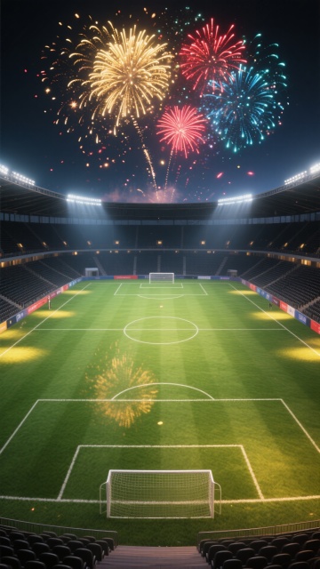 写实风格,高清摄影,特写镜头,一个黑白相间的足球置于前景的绿色足球场上,草叶纹理清晰可见,草尖带有露珠反光,背景是大型圆形露天足球场,观众席坐满观众,球员们在场地中模糊跑动,身着红色球衣,阳光明媚,天空湛蓝,带有少量白云,体育场灯光亮起,光线从斜上方照射,足球表面有高光和阴影,整体氛围充满活力与竞技感,画面层次分明,色彩鲜艳,细节丰富,具有强烈的临场感和真实质感。