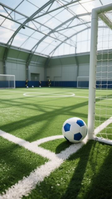 写实风格的足球场景,专业室内足球训练场,绿色人造草坪纹理清晰,白色边界线规整,蓝白相间的足球置于角落边界线上,顶部是透明顶棚结构,金属框架支撑,自然光透过顶棚洒下形成明亮光影,地面有足球和顶棚结构的清晰阴影,整体氛围专业、整洁、充满运动感,可从不同角度展示足球在训练场的不同位置,如中场区域、球门前、边线处,或加入球员训练的动态背景、不同天气光线条件下的场地景象,保持相同的写实质感、光影效果和色彩基调。