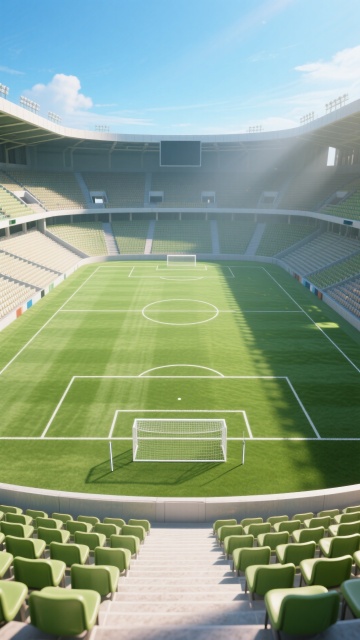 写实风格,高清摄影,特写镜头,一个黑白相间的足球置于前景的绿色足球场上,草叶纹理清晰可见,草尖带有露珠反光,背景是大型圆形露天足球场,观众席坐满观众,球员们在场地中模糊跑动,身着红色球衣,阳光明媚,天空湛蓝,带有少量白云,体育场灯光亮起,光线从斜上方照射,足球表面有高光和阴影,整体氛围充满活力与竞技感,画面层次分明,色彩鲜艳,细节丰富,具有强烈的临场感和真实质感。