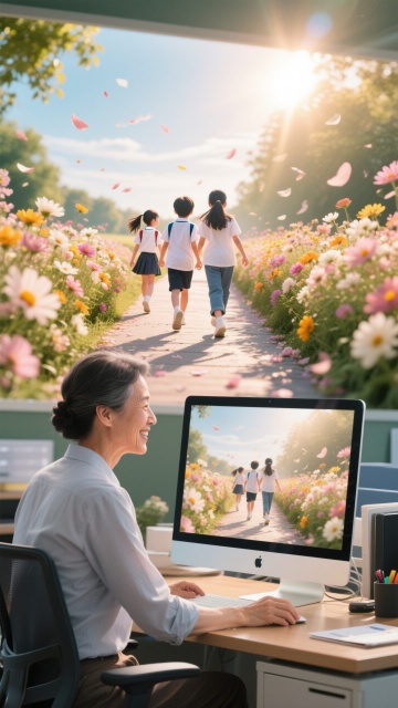 《窗前的红与银》定格了乡村校园的温情瞬间:窗内,头发缀着银丝的女教师含笑批改作业,那银白是她坚守教育的印记;窗外,系红领巾的孩子们或诵读或踢球,鲜活热烈。​ “银” 的沉静与 “红” 的朝气相映,既成视觉对比,更暗喻教育的传承 —— 教师的心血,正借这群少年在山村里播撒希望。
