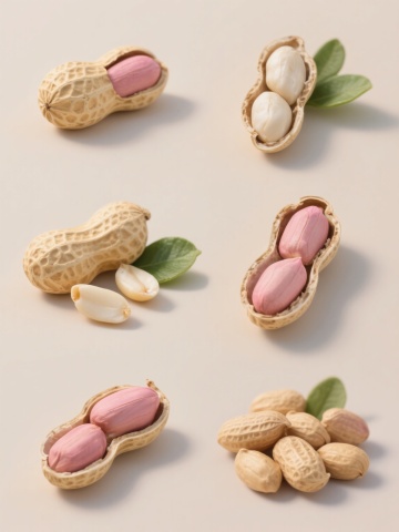 一张包含六个完全不同造型花生元素的系列素材集合海报,纯白纯色背景,保持高写实摄影风格,每个花生造型细节清晰:带壳花生展现其浅棕色粗糙纹理外壳,剥开的花生露出两颗饱满的红棕色花生仁,部分花生旁点缀几片新鲜翠绿的花生叶;六个花生造型分别呈现:1. 完整闭合的带壳花生,2. 微微裂开露出部分果仁的带壳花生,3. 完全剥开壳、果仁紧密排列的花生,4. 带壳花生与单独果仁组合,5. 多颗带壳花生堆叠,6. 带壳花生与两片绿叶搭配;所有花生元素色彩真实自然,带壳花生外壳有细微光影变化和自然纹路,果仁表面光滑有光泽,绿叶颜色鲜亮有清晰叶脉;六个花生造型规整排布,呈两行三列均匀分布,整体构图平衡对称,画面简洁干净,突出花生元素本身的质感与形态,符合食品素材高清、真实、诱人的视觉效果。