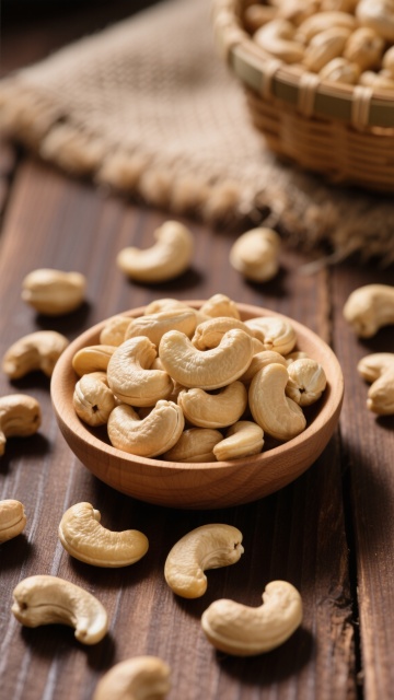 高清写实风格摄影,多种混合坚果(包括腰果、杏仁、核桃、碧根果、开心果等),重新布局的坚果组合,浅棕色陶制碗盛满坚果置于画面中心,部分坚果散落在碗的周围,粗麻布餐垫铺在复古做旧木质桌面上,温暖柔和的自然光从斜上方照射,形成清晰自然的光影层次和柔和阴影,坚果外壳纹理细节丰富,整体色调为原木色、棕色和坚果自然色泽的和谐搭配,营造出质朴、健康、原生态的氛围,画面构图饱满均衡,焦点清晰突出坚果的质感与新鲜感。