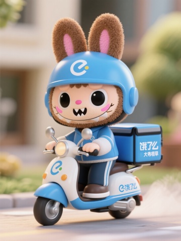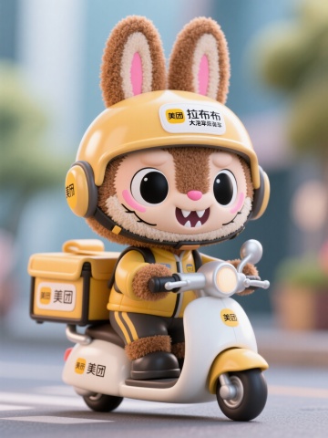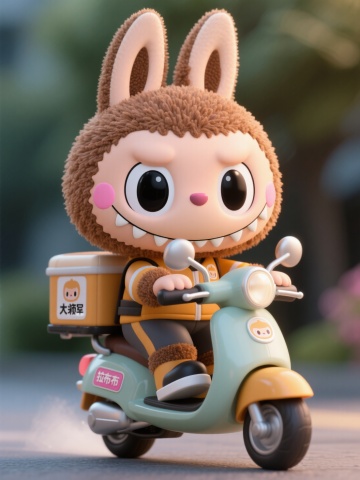 软3D风卡通形象,拉布布人化小怪兽骑电动车,可爱感十足,传递欢乐氛围。
