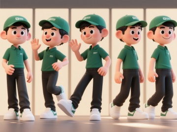 泼氛围的要求。 该套装包含六个描绘国际亚裔送货司机的3D动画角色。虽然姿势和角度各不相同,但他们都有一个共同点:戴着深绿色的帽子,穿着深绿色的polo衫、黑色的长裤和白色的运动鞋。主色调为奶油色,背景统一。角色五官圆润,眼睛大大的,表情夸张可爱,嘴唇微微张开,留着黑色的短发。男孩们摆出了各种姿势(比如挥手、跳跃、走路、站立、转身和微笑),但他们都穿着同样的衣服。所有图像都整齐地排列在一个框架内,保