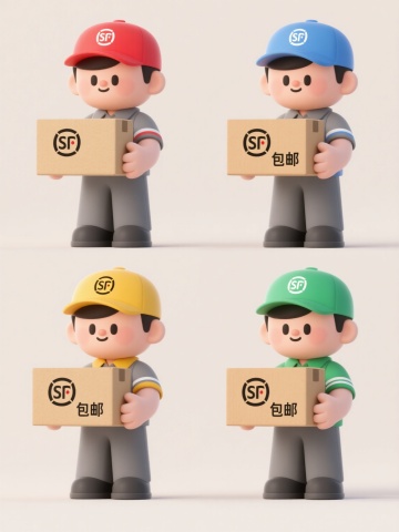 3D卡通风格快递员形象,戴着黑色印有白色“SF”标志的棒球帽,身穿灰色短袖制服,制服领口和袖口有红色装饰边,左胸有“SF”标志,右手握着一个印有“SF”标志的棕色纸箱,左手握拳,面带微笑,脸颊有红晕,整体造型圆润可爱,色彩鲜明,立体感强,白色背景
