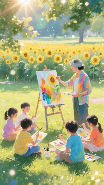水彩风插画,清新感十足,印象画派手法描绘师生共绘向日葵,阳光明媚。