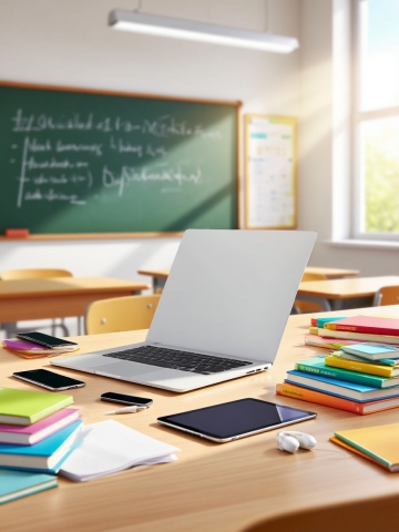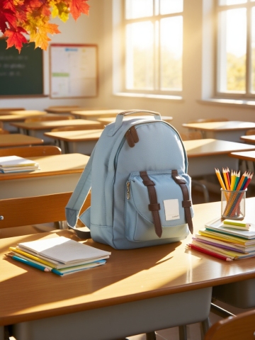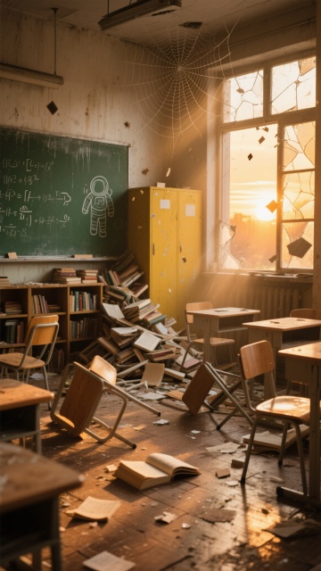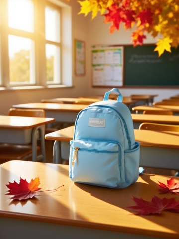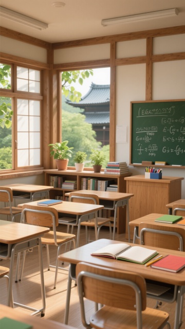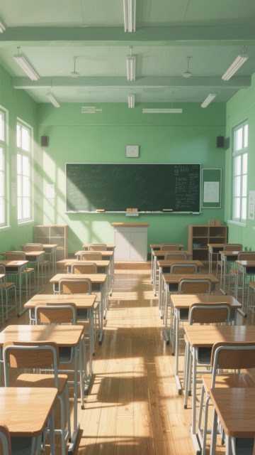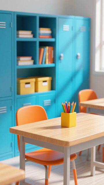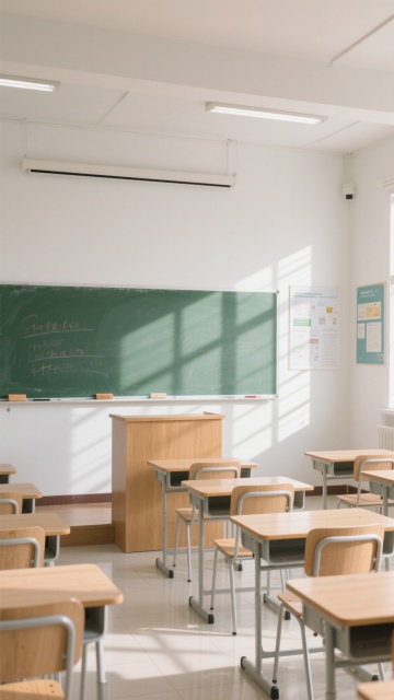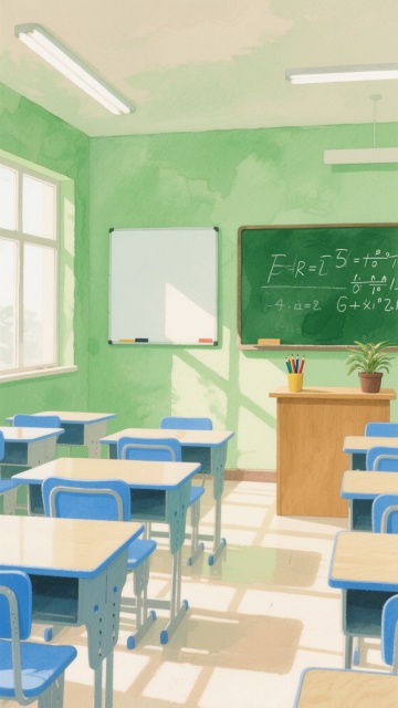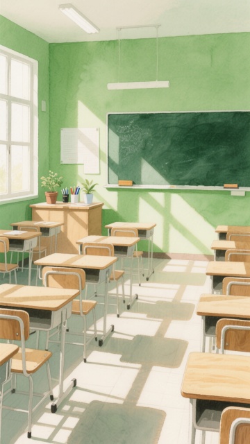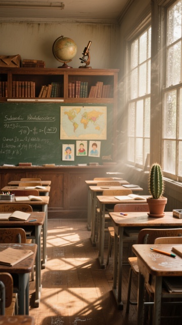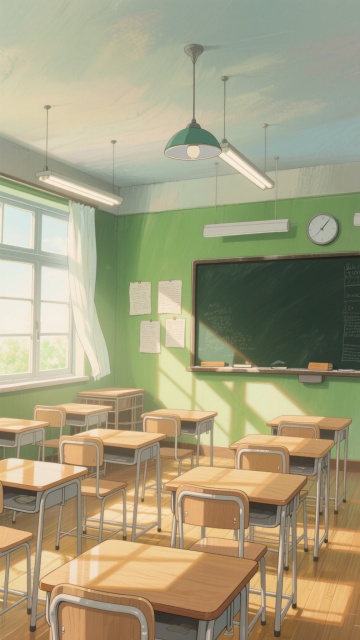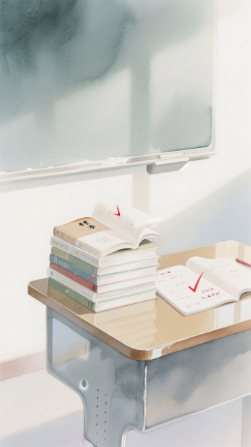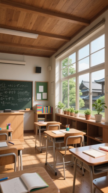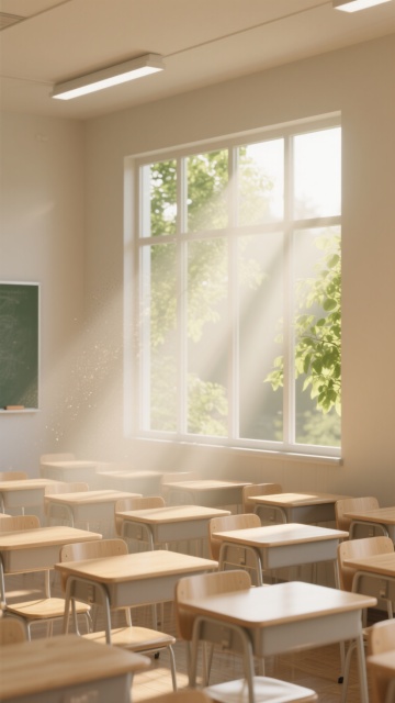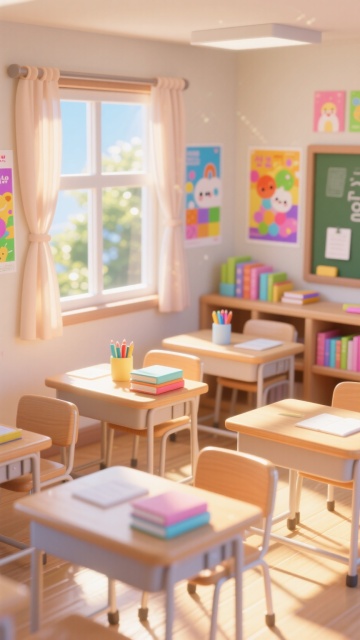 尺寸为1080X1920,,画面整体为鲜艳明亮的暖色调,背景为的教室内景(三分之二可见黑板,三分之一为窗户,窗外是阳光明媚的校园风景,不要出现天花板),前景是课桌(桌面纹理清晰,无遮挡),聚焦在前景课桌上,画面重心居下