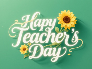 绿色背景,白色英文字‘Happy Teacher's Day’,笔画融合向日葵装饰元素,艺术感