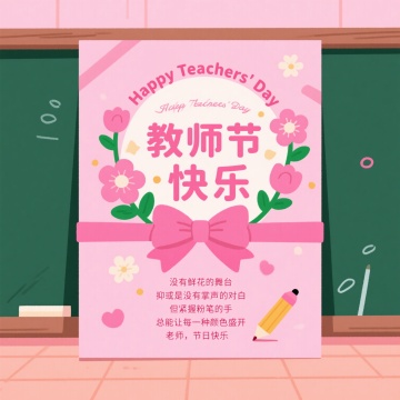 清新插画风设计,大字突出“教师节快乐”,辅以甜美花卉点缀,营造温馨节日氛围。