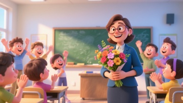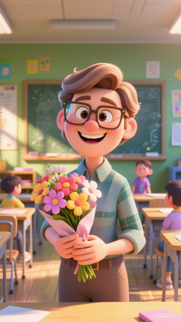 温馨软3D风,卡通教师手捧鲜花与贺卡,教室场景洋溢节日祝福氛围。