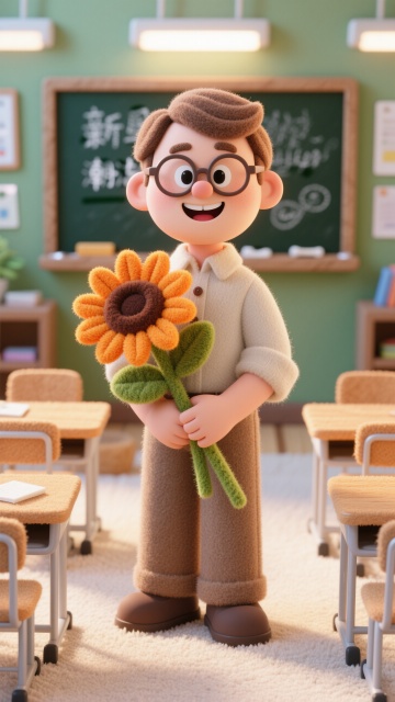 3D卡通风格,拟人化老师手持毛茸茸向日葵,教室温馨可爱,充满童趣。