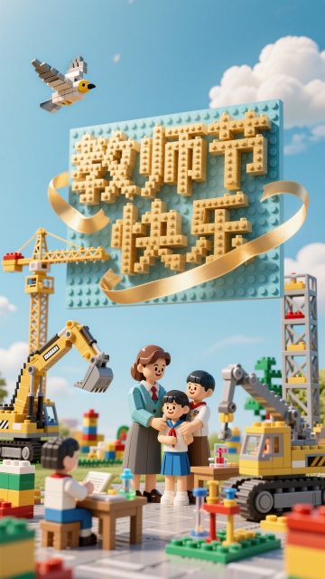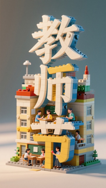 这张教师节作品以乐高积木搭建出创意场景,“教师节”三字与建筑相融,呈现3D立体风格。积木块的拼接如同教师的教学,将知识与创意一块块搭建进学生的成长中。画面里的师生互动场景,鲜活展现了校园的温暖日常。这种设计融合乐高元素与建筑风格,色彩鲜明且充满艺术感,灵感在于以童趣化的积木构建,象征教师用创意与耐心,为学生搭建知识的城堡、成长的乐园,在教师节之际,传递出对教师搭建人生基石的感恩与赞颂。